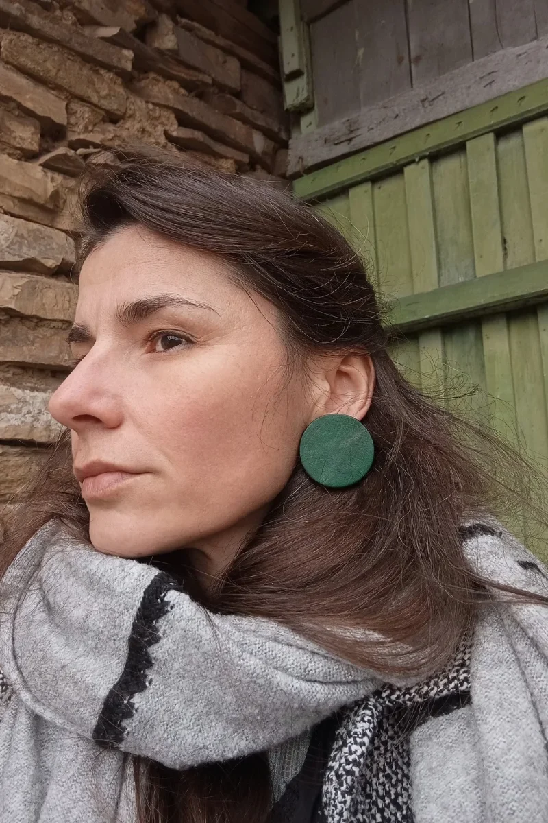 Обеци от кожа. Щифтът е от медицинска стомана. Диаметърът им е 4 см.