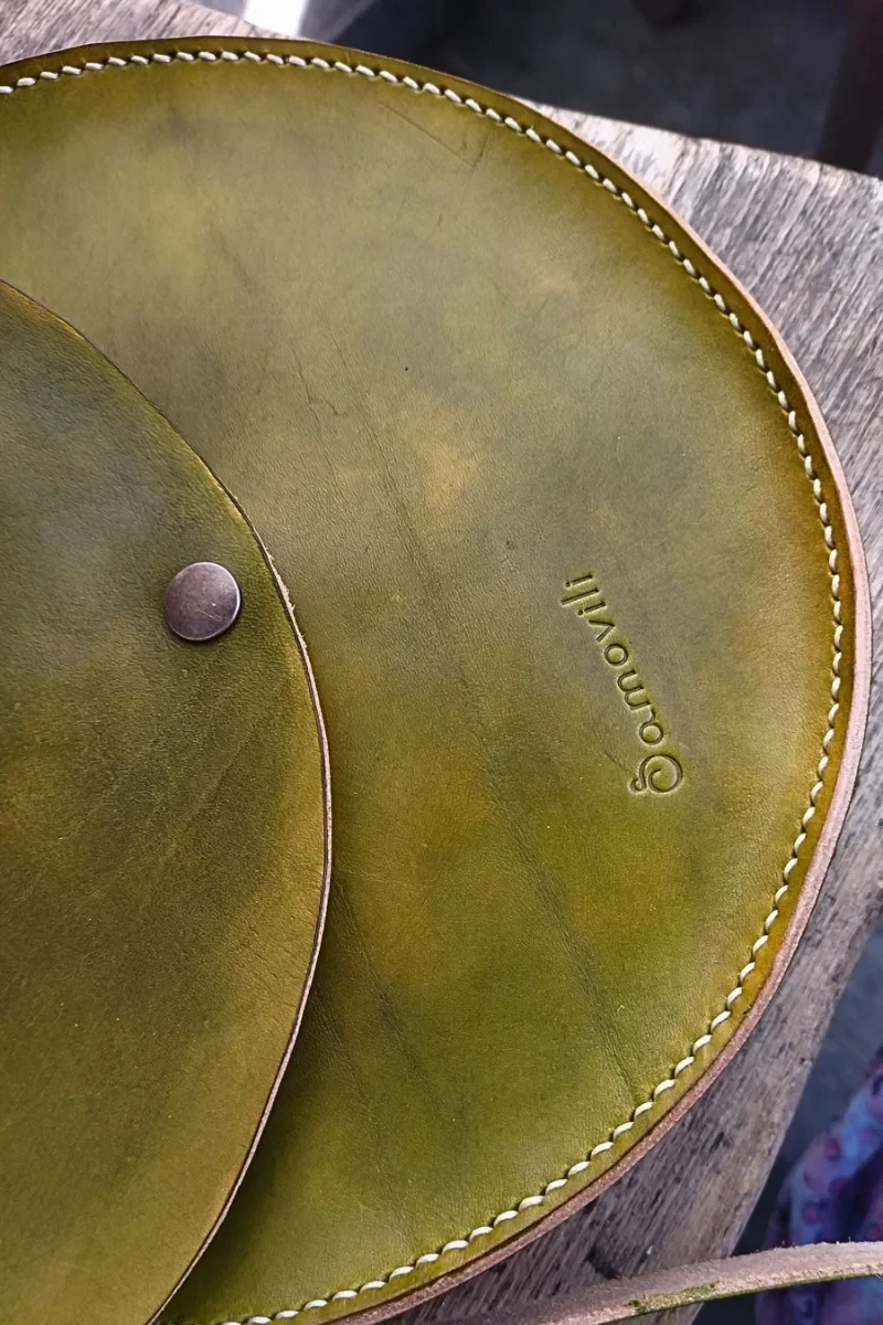 Материал: естествена телешка кожа (растително дъбен бланк с дебелина 2 мм); метал – месинг.